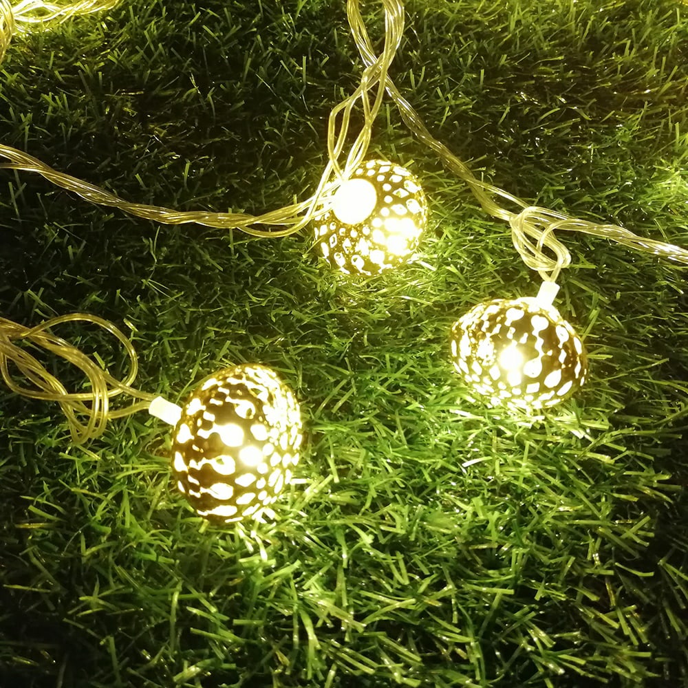 Представляет собой проволоку оснащенную яркими диодами с мягким теплым свечением. Каждая лампочка украшена шариком из тонкого ажурного металла золотистого цвета диаметром 25 мм. Гирлянда работает от обычной сети 220V, имеет низкое энергопотребление и высокий ресурс благодаря светодиодам и один режим беспрерывного свечения.